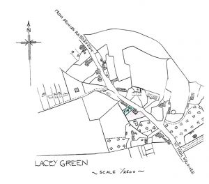 Lot 3 (Late called Kia Cottage) Lacey Green. An Old-Fashioned Cottage & Garden.   Situate in the village, occupying an elevated position commanding charming views of the surrounding district.   The cottage contains 4 rooms, woodhouse and water tank and is let to Mr Amos Janes (click Amos, Clara & Pol Ann Janes), an old-standing with a rent of £6-10s-0d per annum. The tenancy is a yearly one from October 11th.
