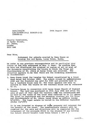 1964. An enquiry was raised with Charity Commission by Joan West, treasurer of the Managers of St John's School, Lacey Green after consulting John Gabbitas, solicitor. She had realised that the vicar, Raymond Maynard had put The School House up for sale. This house belonged to Lacey Green School, The Trustees of both were the vicar and churchwardens, held by the Charity Commission for Lacey Green.